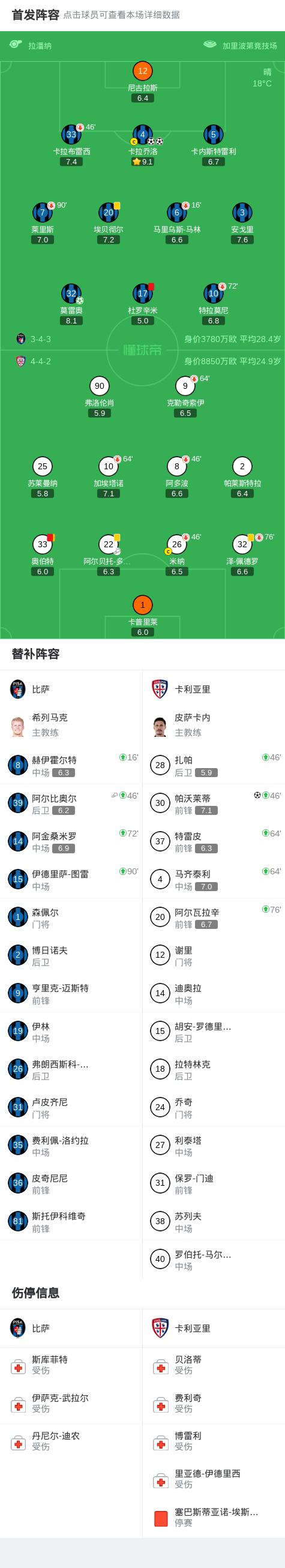 第67分钟,卡利亚里球员阿尔贝托-多塞纳助攻帕沃莱蒂打入一球。